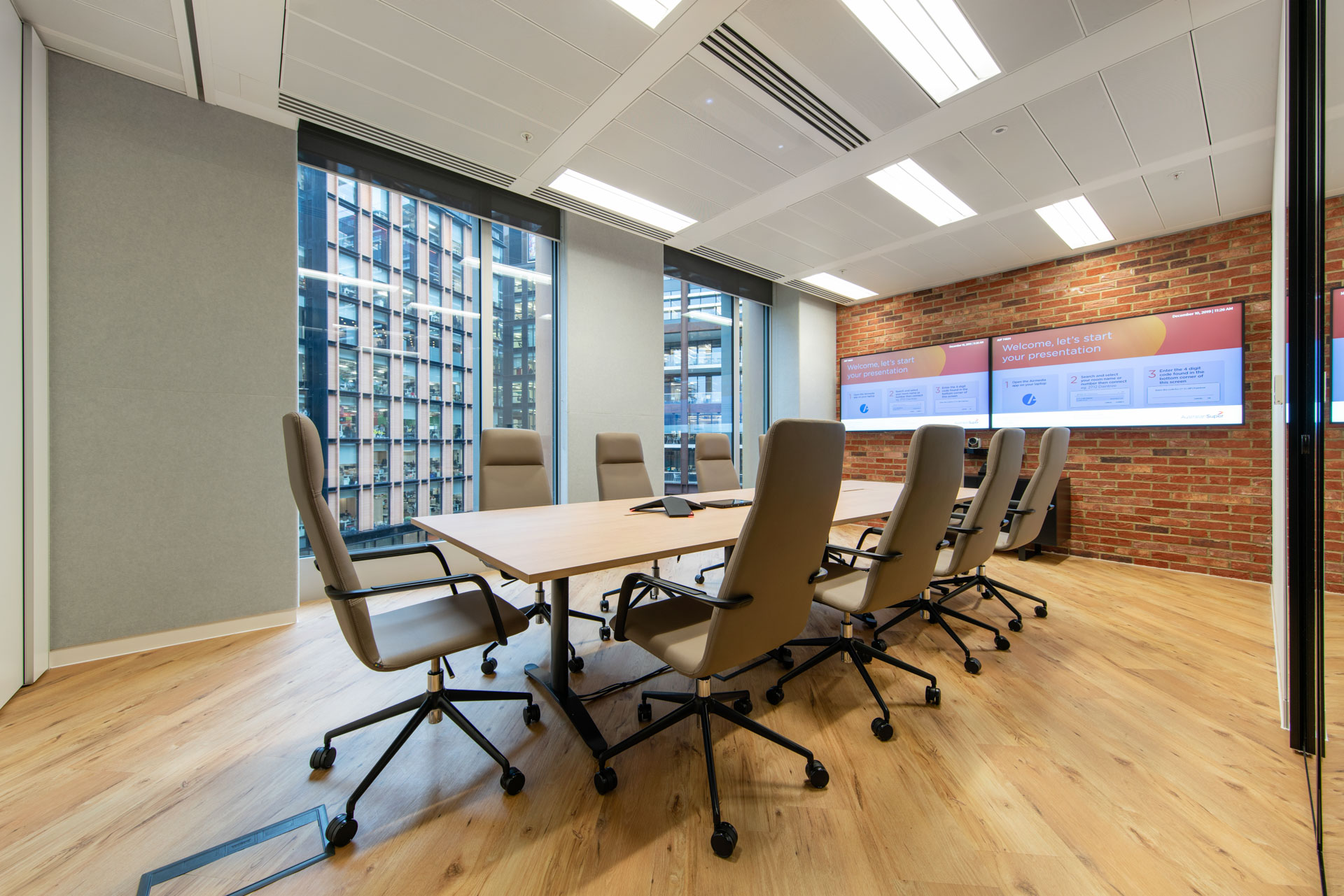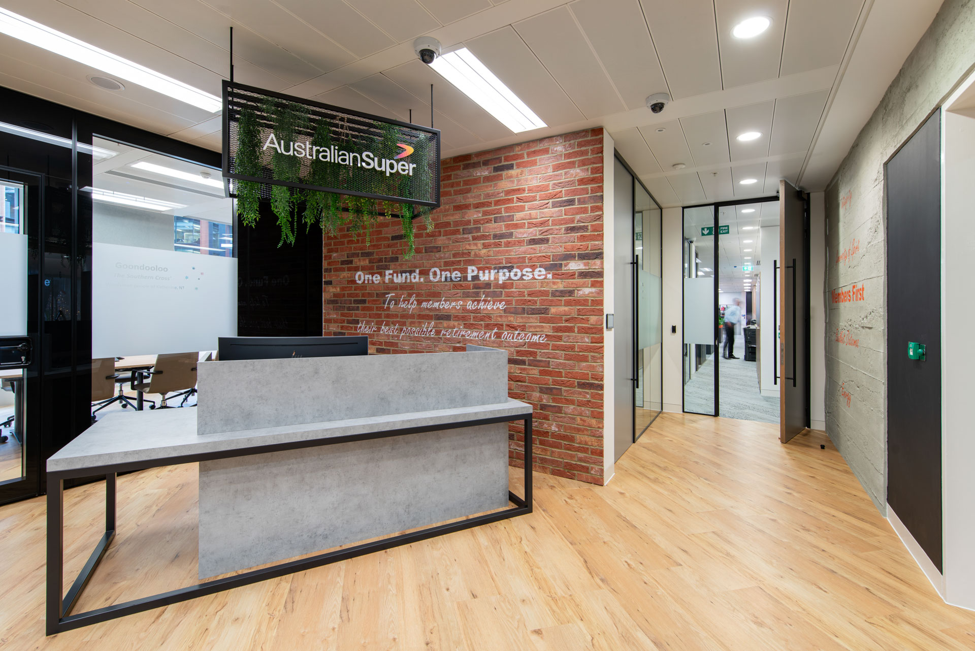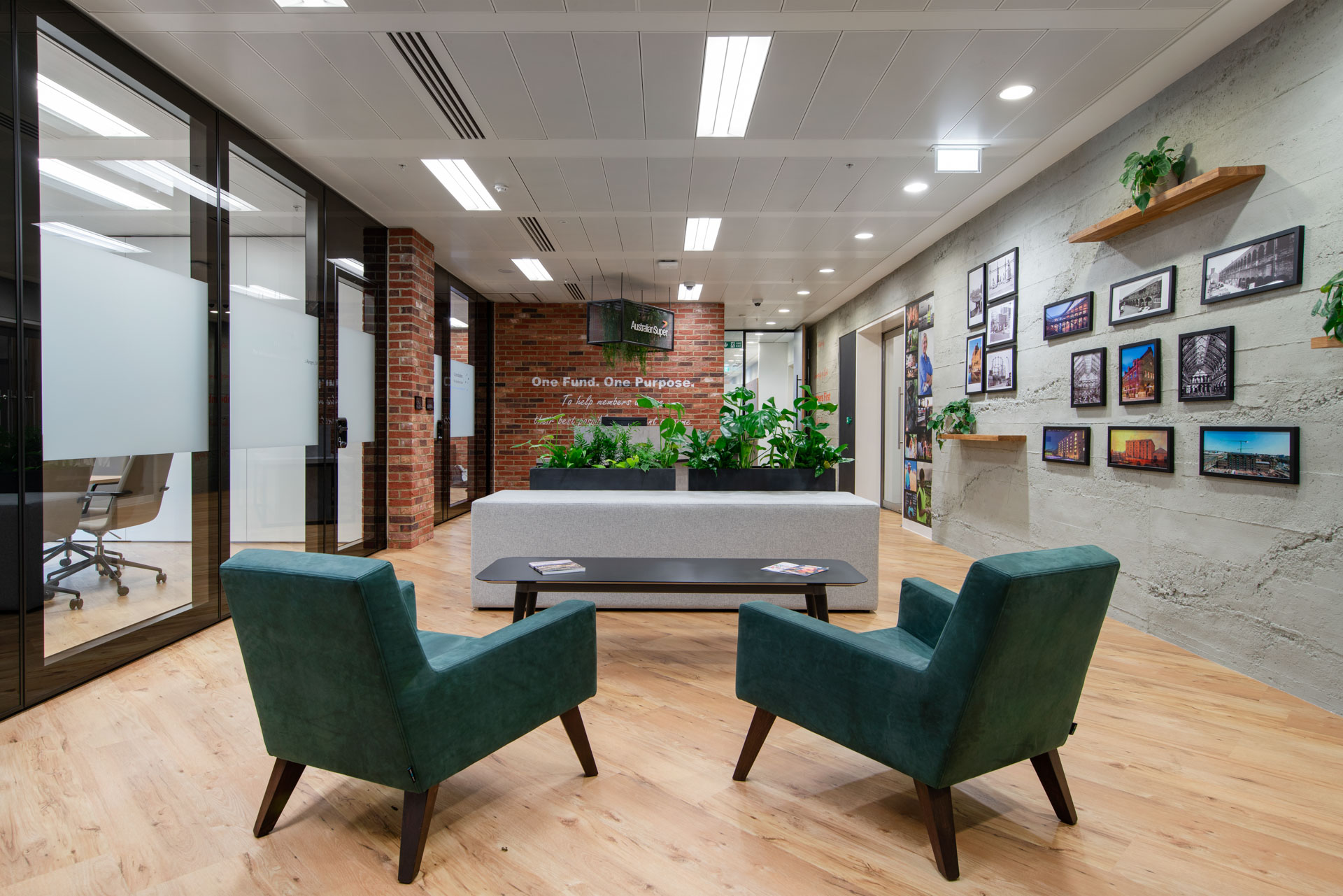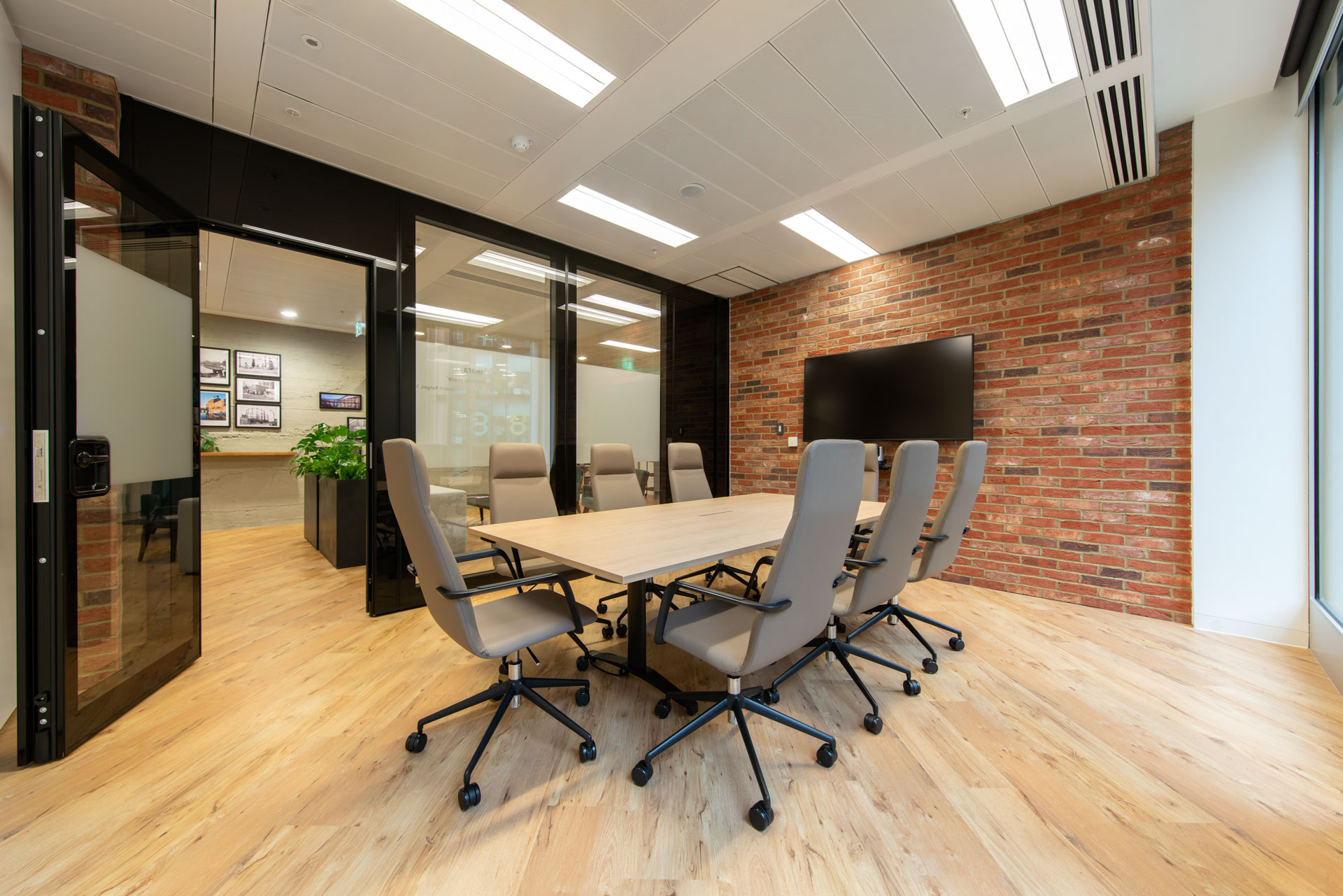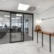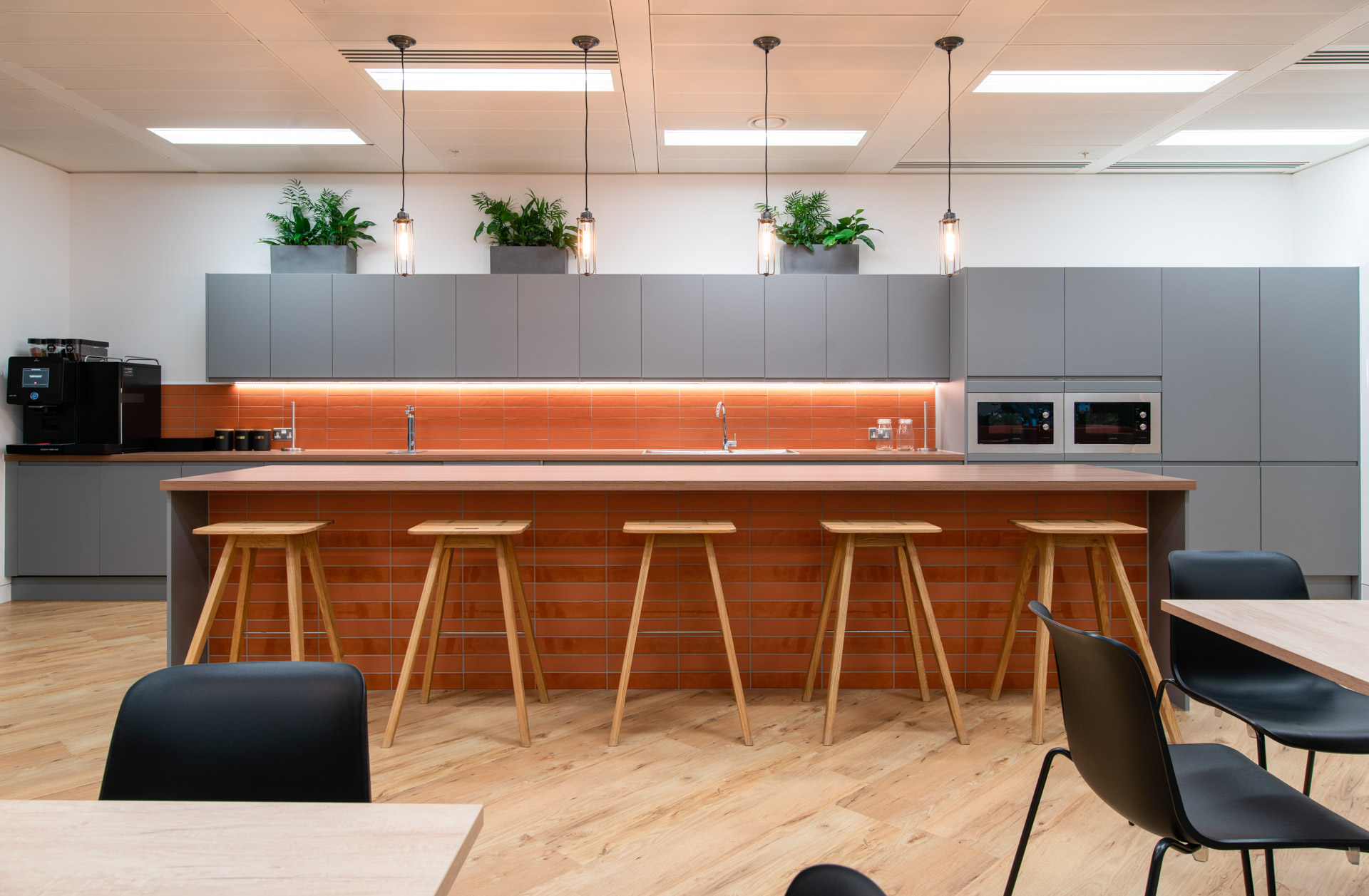 Another brilliant industrial design office from Peldon Rose bought to life by our teams. The entrance and boardroom space was created using solid partitions and Fusion's banded single glazed partition. The ceiling needed modification and acoustic barriers were fitted before adding the finishing touches; timber door sets & feature brick slips. The large grey open plan tea point break out area compliments the aesthetic using orange elongated-brick shaped tiles and wood effect worktops.