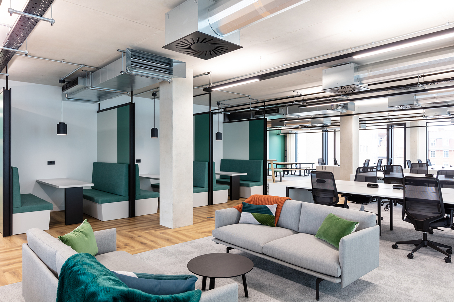 Thirdway Interiors designed this great white and grey scheme office, which looked fantastic against teal booths, sofas and feature kitchen wall. The light was able to flow around the whole office by using an interesting mix of solid and bespoke partial joinery and glazing partitions.