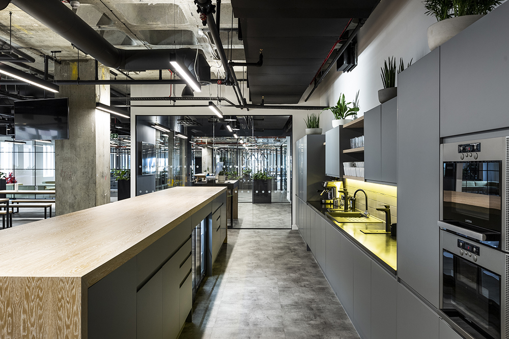 This fantastic industrial style, open plan, office design is made up of different use areas divided by primarily glass partitions and bespoke joinery. Our teams built the spaces using solid and glazed partitions with timber and glass doorsets; ceilings were added within smaller meeting rooms and boardrooms. The large striking kitchen area was installed to faciliate staff needs, whilst maintaining a minimal appearance.