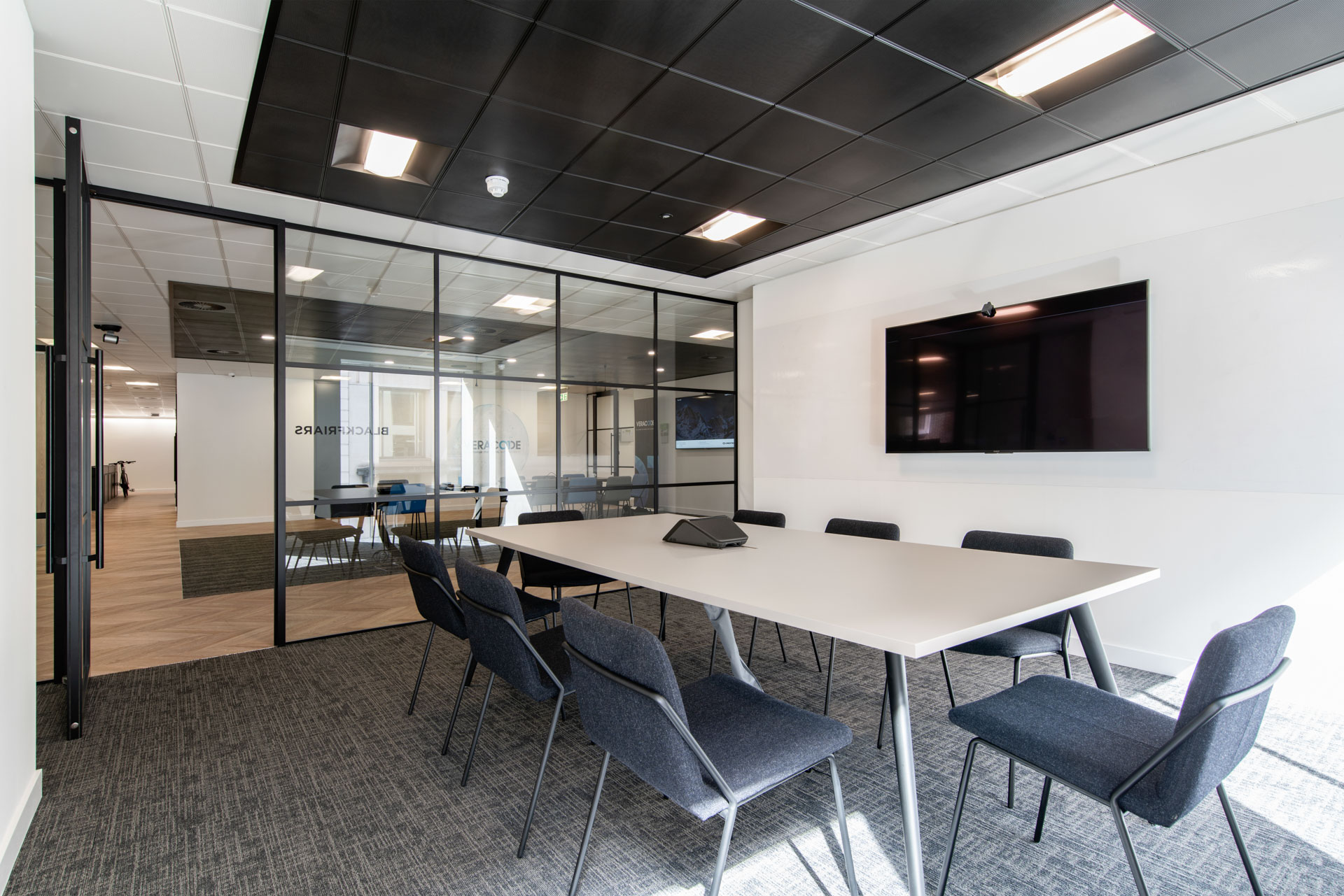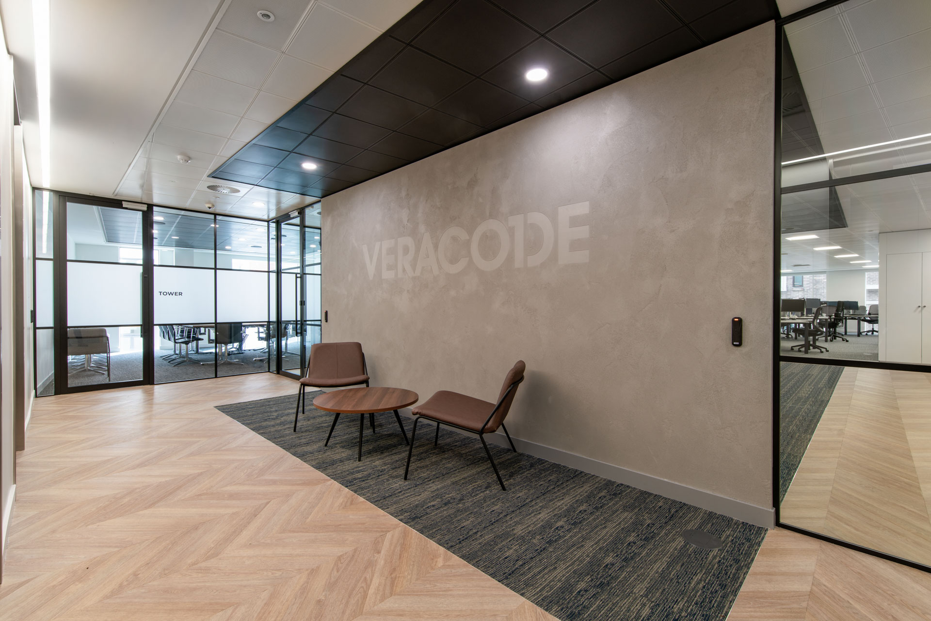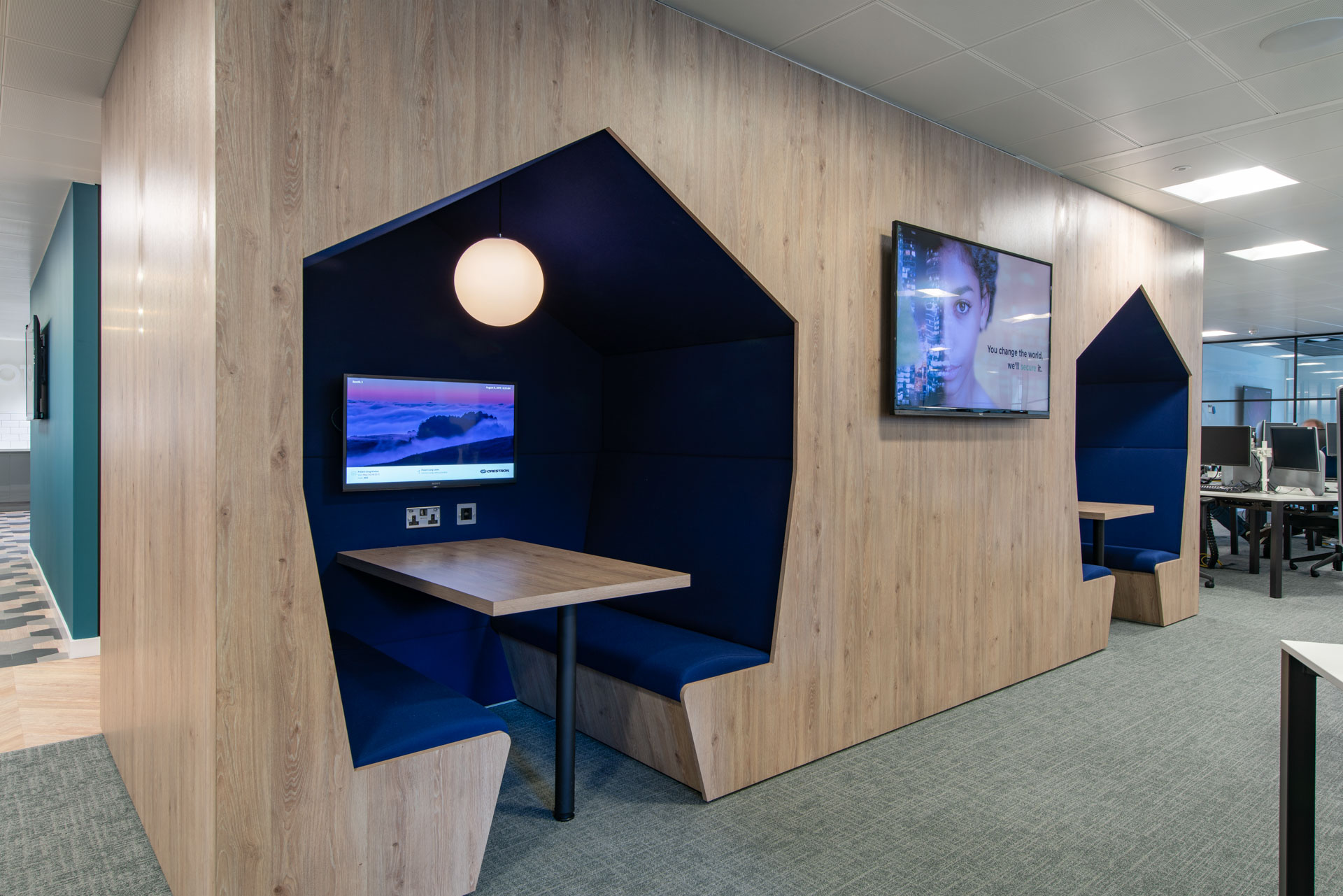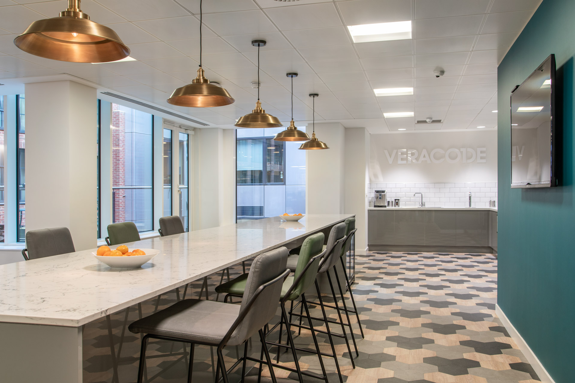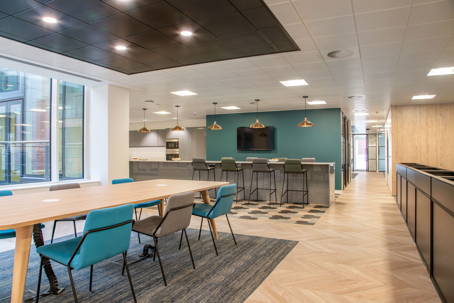 This open plan office design offers a change in view from every angle. Our teams created the workspace layout using 100mm solid partitions and Fusion banded single glazed partitions, with acoustic barrier to ensure user privacy. The large beautiful tea point area with hexaganol floor tiles and corian worktops really looks beautiful and